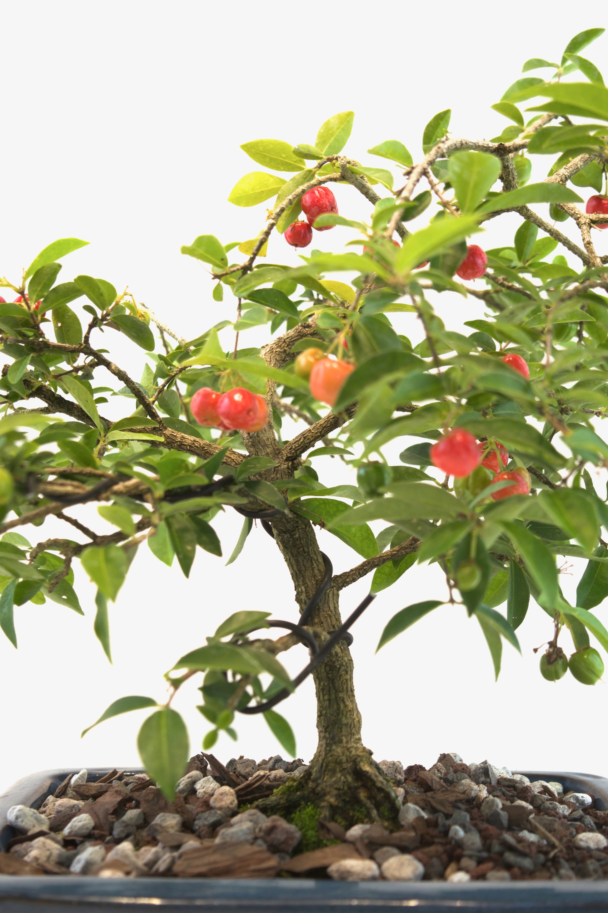 A flowering bonsai with edible red cherries and pink blooms, this Barbados Cherry adds tropical charm and color to any space. Great for indoors or warm outdoor spots! One of a Kind