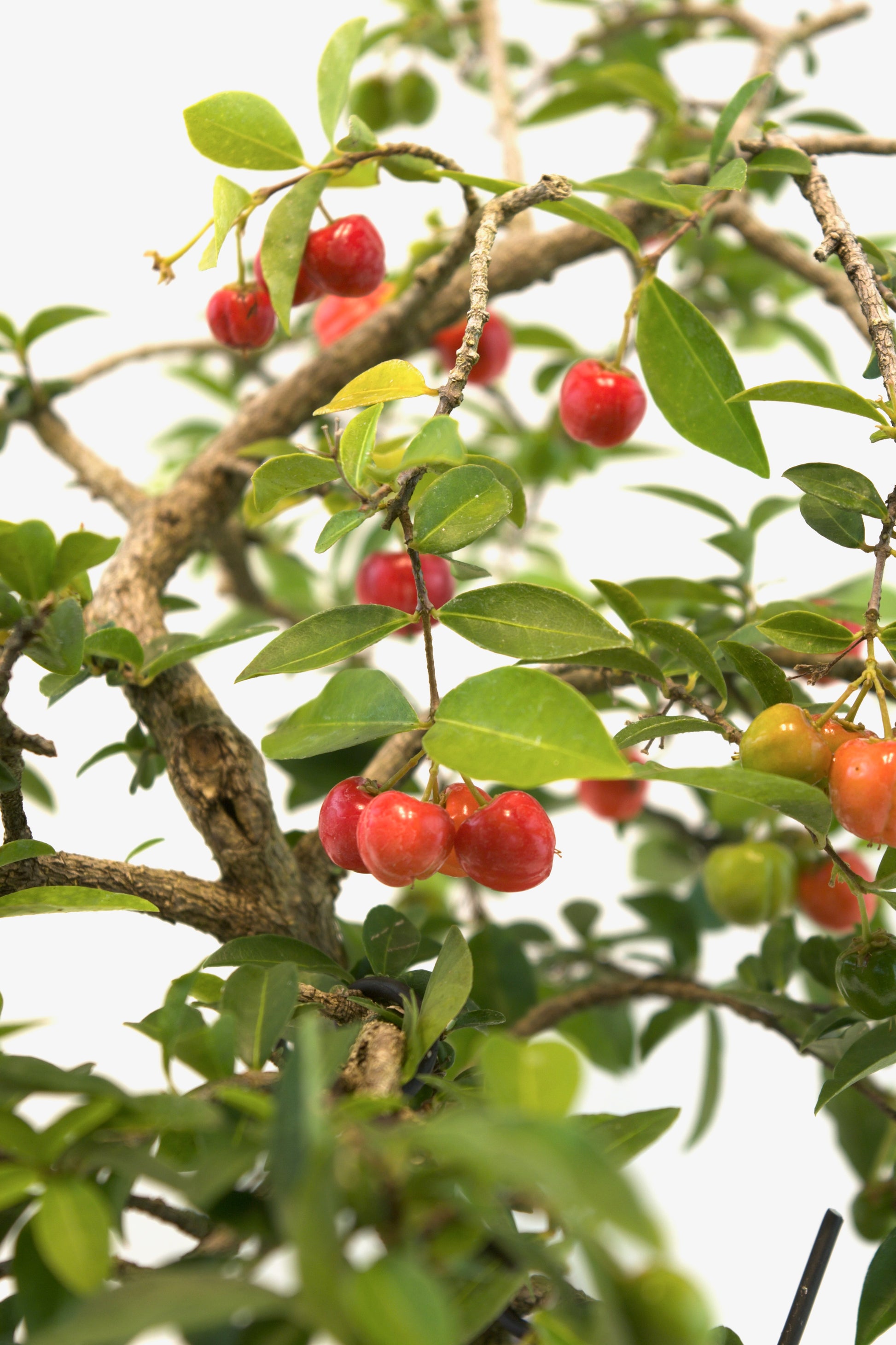 A beautiful tropical shrub or small tree, the Barbados Cherry (Malpighia punicifolia) is prized in bonsai for its graceful branching, glossy green foliage, and charming pink flowers that give way to bright red, edible cherries. Native to the Caribbean and Central America, this species grows in warm, humid regions and is a favorite among bonsai artists for its ornamental appeal and fruiting potential. Its compact size and rewarding growth habits make it suitable for both beginners and experienced collectors.