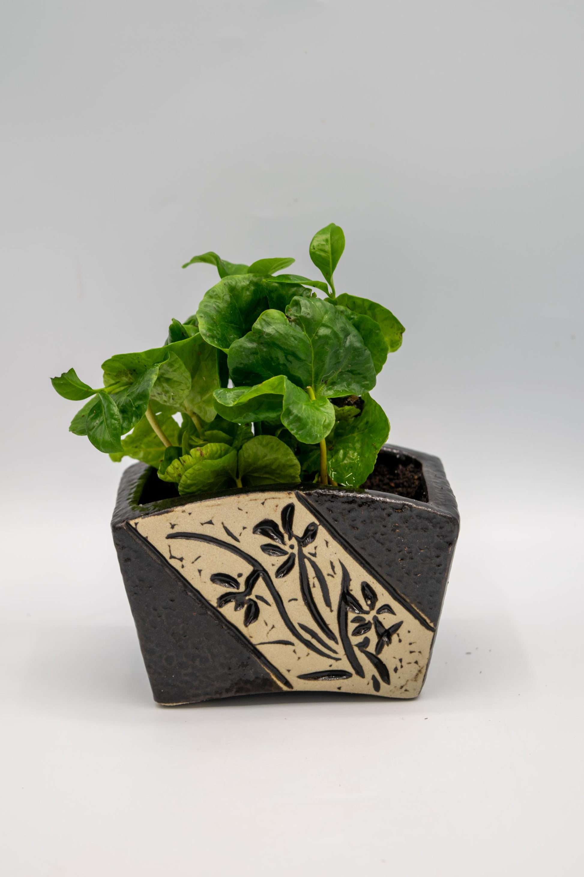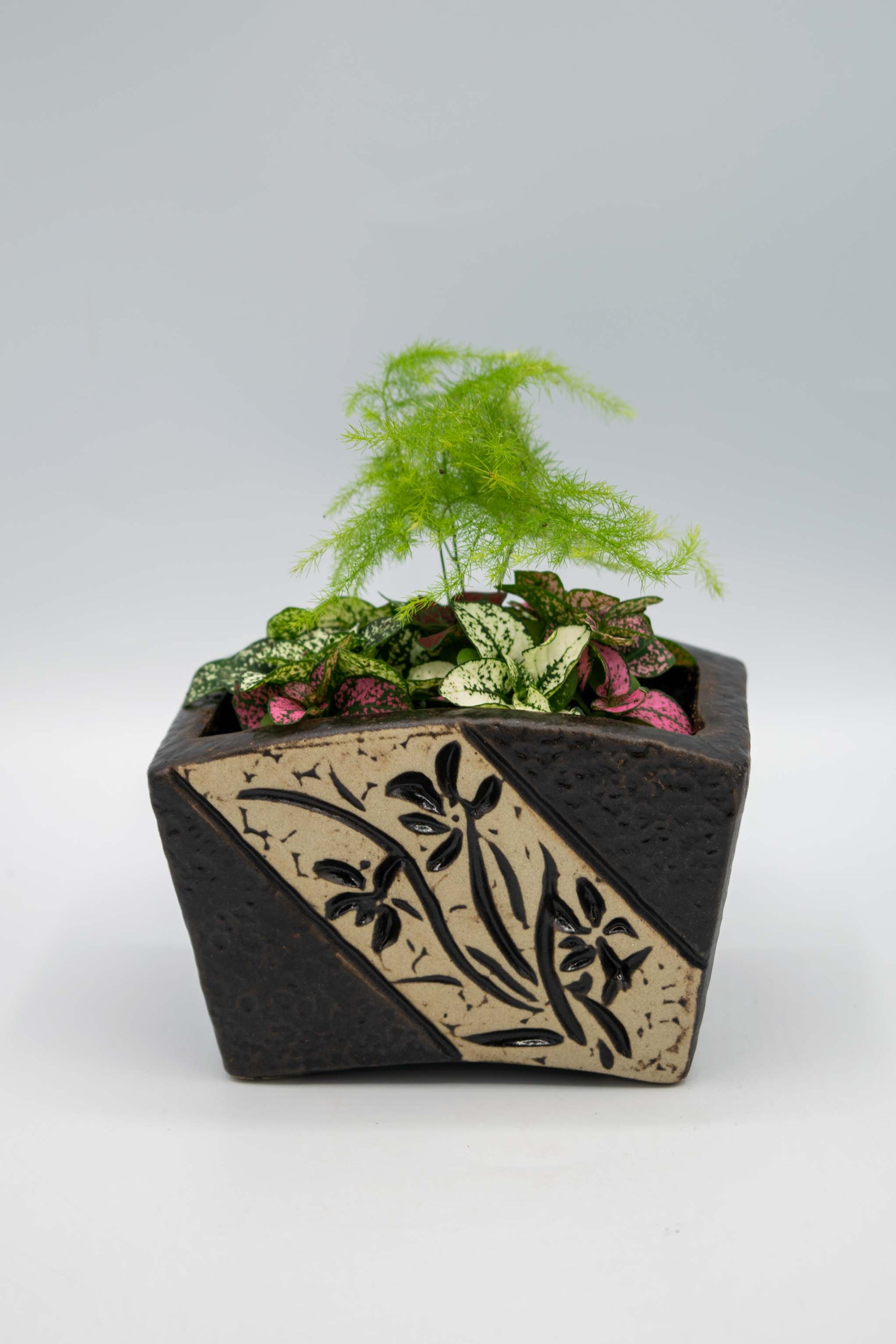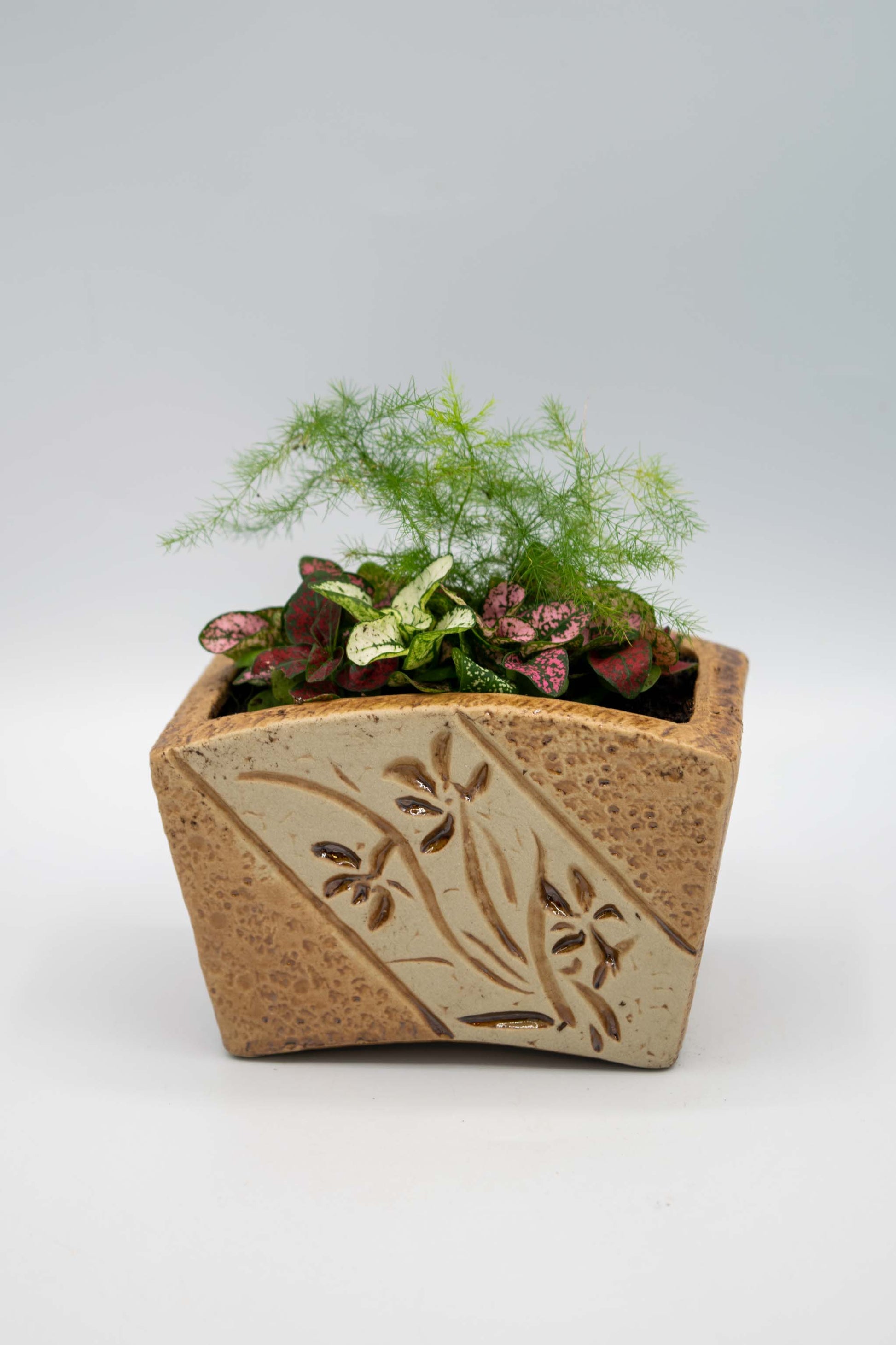 Floral planter from Taiwan potted with a low maintenance house plant of your choice. All our plant selections are great for the office, outdoor in the shade, or indoor bright area.