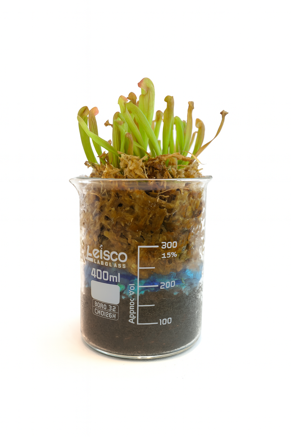 A striking carnivorous pitcher plant in a clear 400ml beaker—perfect for desks or windowsills. 'Dana’s Delight' features vibrant red and green traps that naturally capture insects. Unique, low-maintenance, and eye-catching