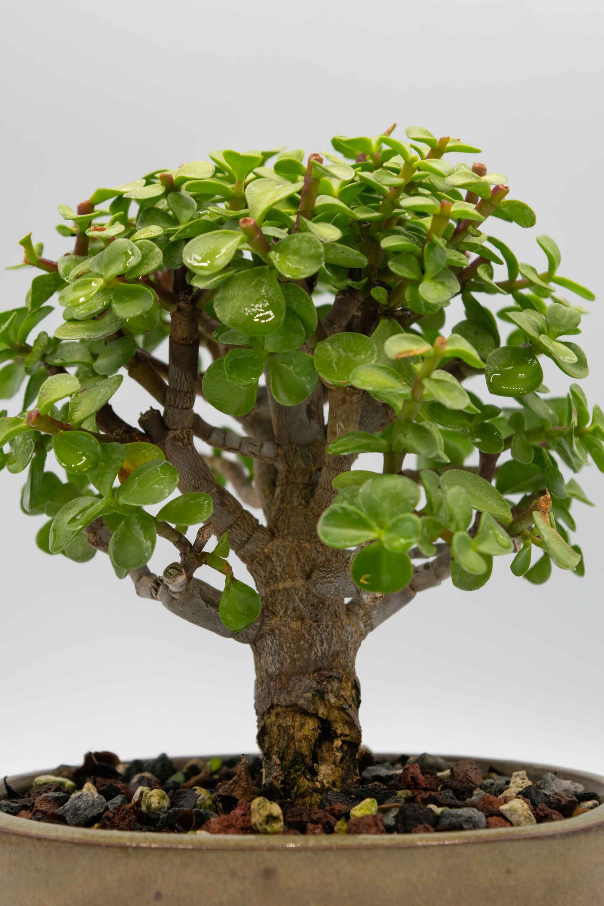 A Fleshy, softly woody shrub or small tree up to 3m to 4m, often sprawling; occurring on dry rocky hillsides and in succulent scrub. Portulacaria Afra, also called “Elephant Plant” or “Small leaf Jade” is relatively new in bonsai but one that almost anyone can grow. It can withstand long periods without water making them excellent plants for beginners. Advanced students of bonsai find them excellent material because they adapt to any style and develop relatively fast. The bark is green when young, becoming red-brown to slate grey, and smooth with conspicuous leaf scars. Leaves are simple, opposite, almost circular.