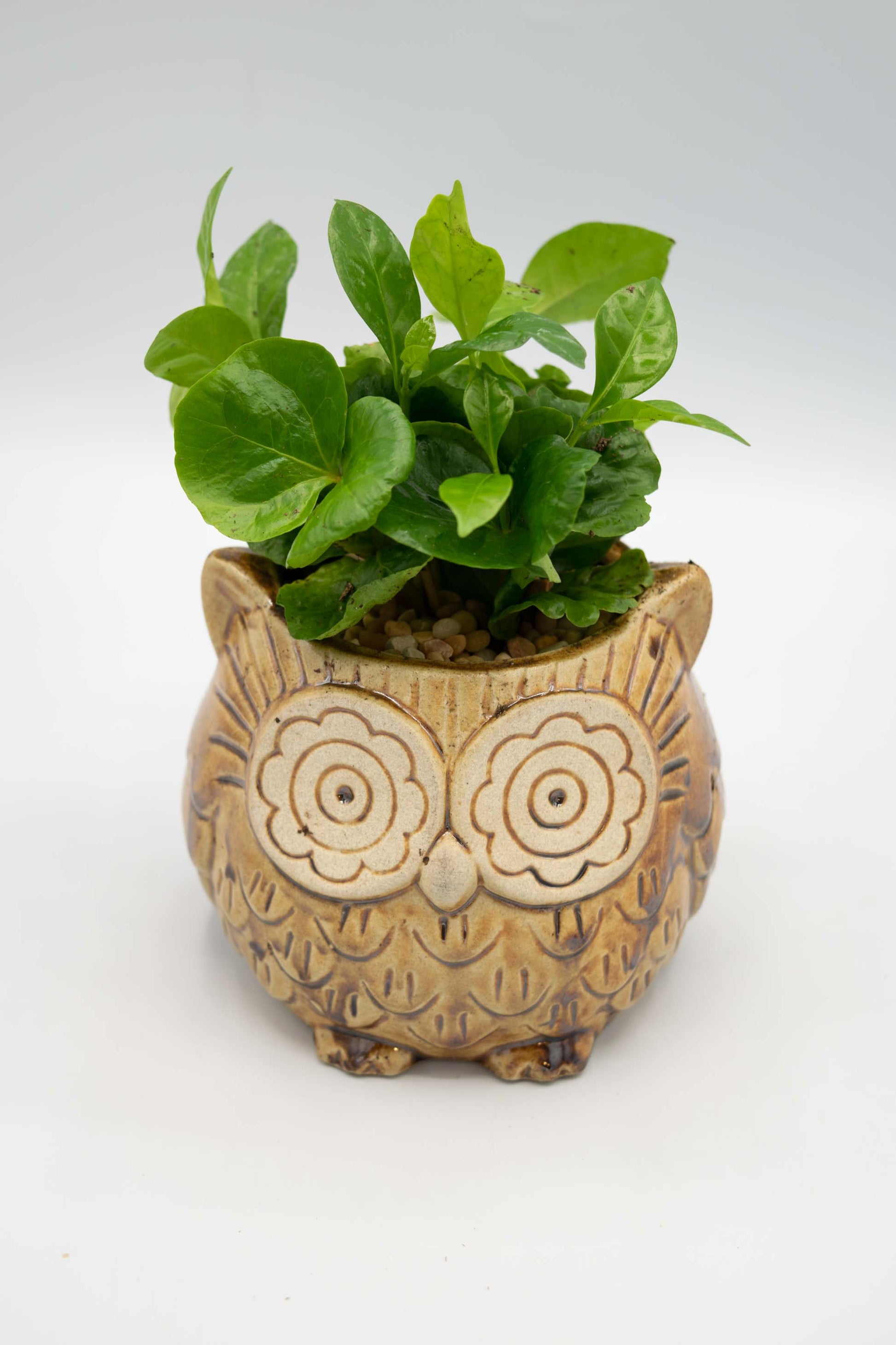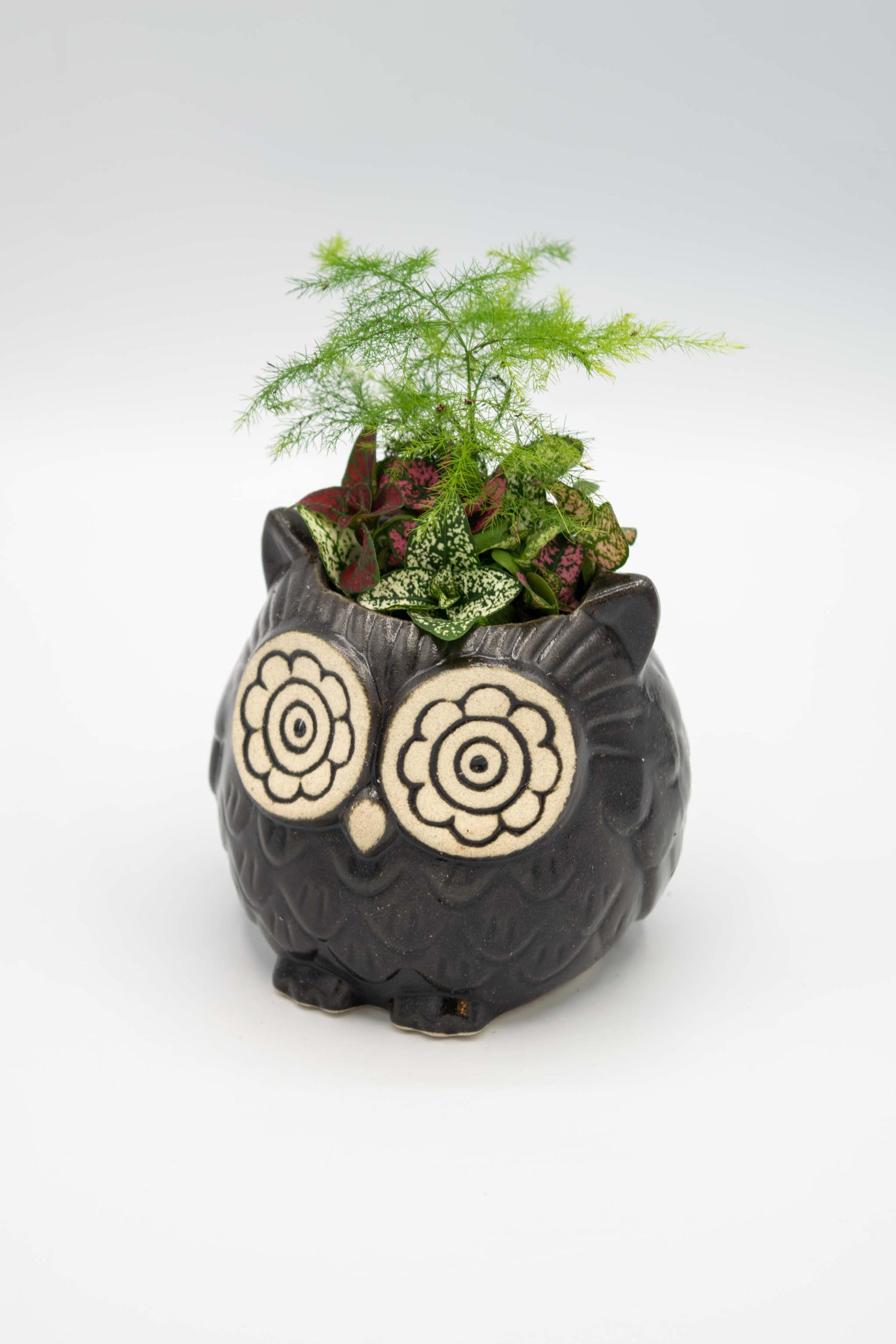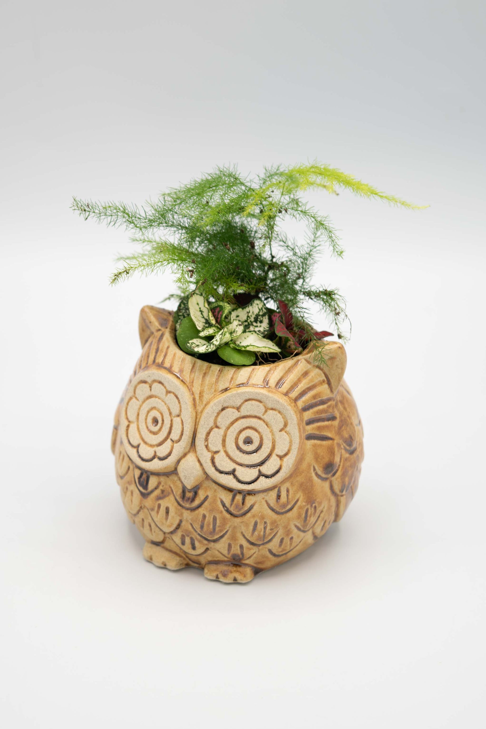 Owl Planters from Taiwan potted with a low maintenance house plant of your choice. All our plant selections are great for the office, outdoor in the shade, or indoor bright area.