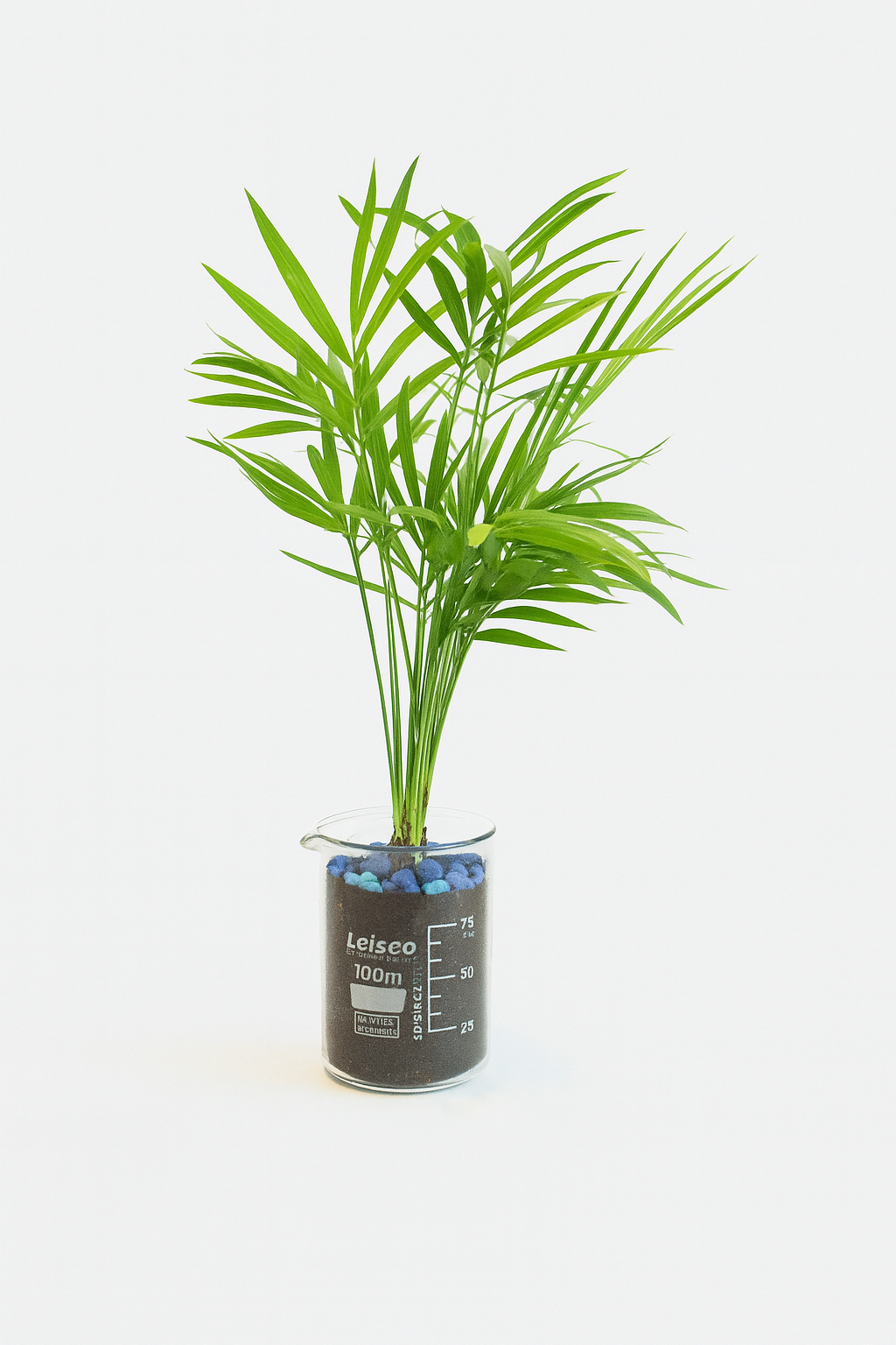 Add a touch of the tropics to your space with this Mini Palm Tree planted in a sleek 100ml lab-style beaker. With its fine, arching fronds and compact size, this palm brings calming, beachy vibes to desks, bookshelves, or windowsills.