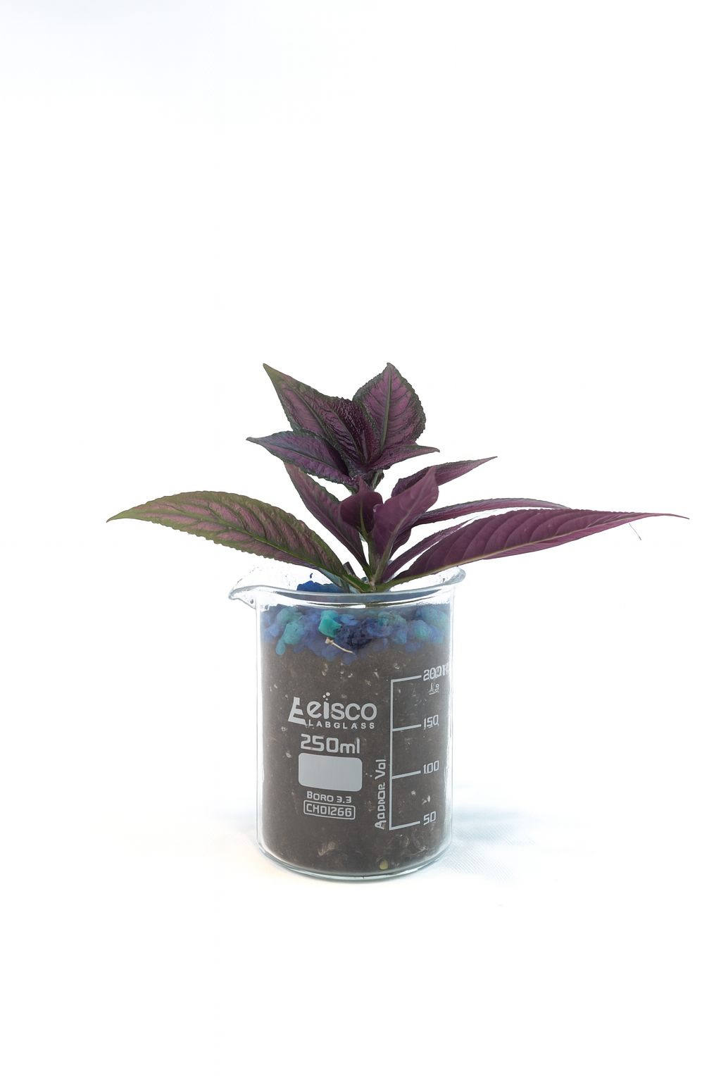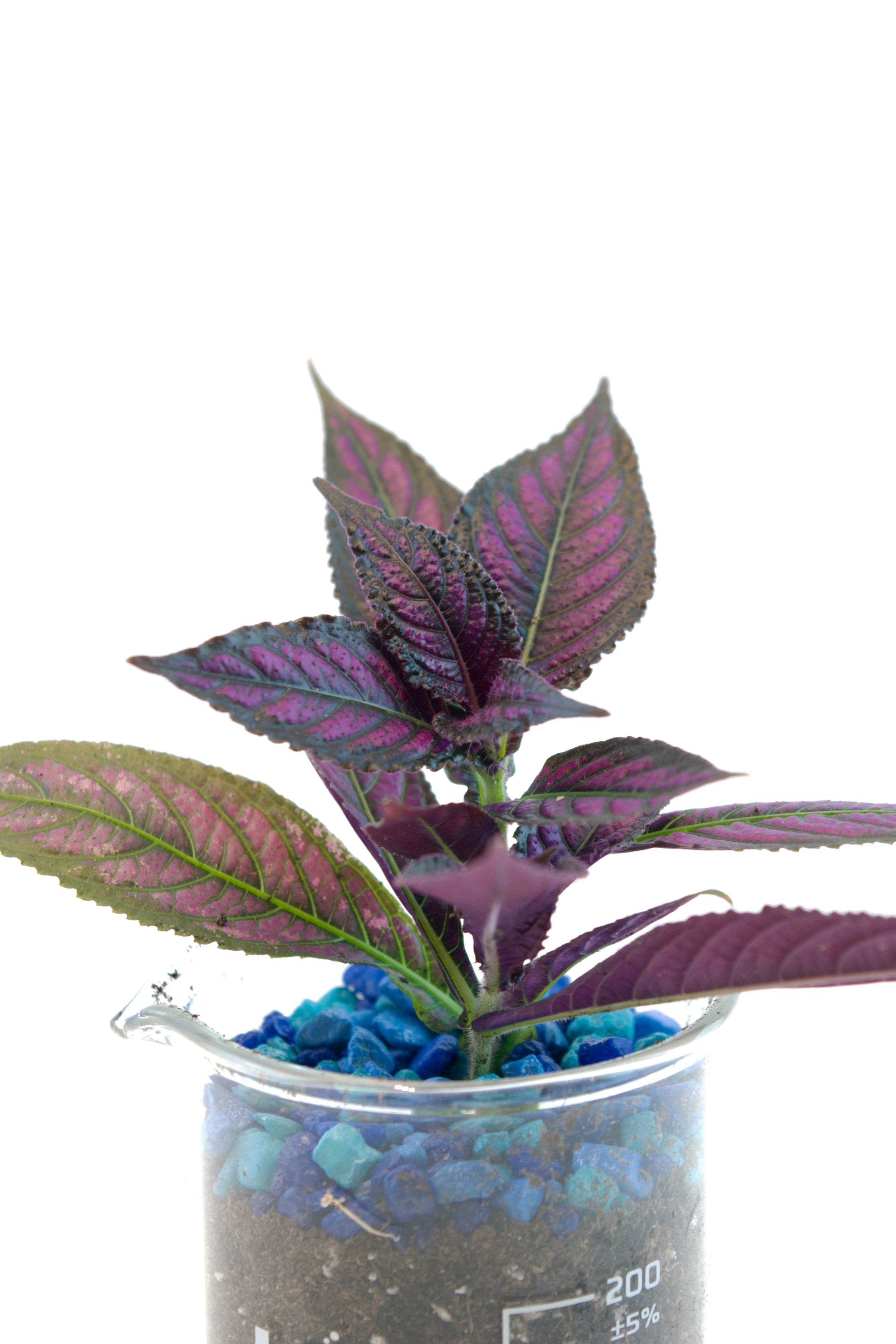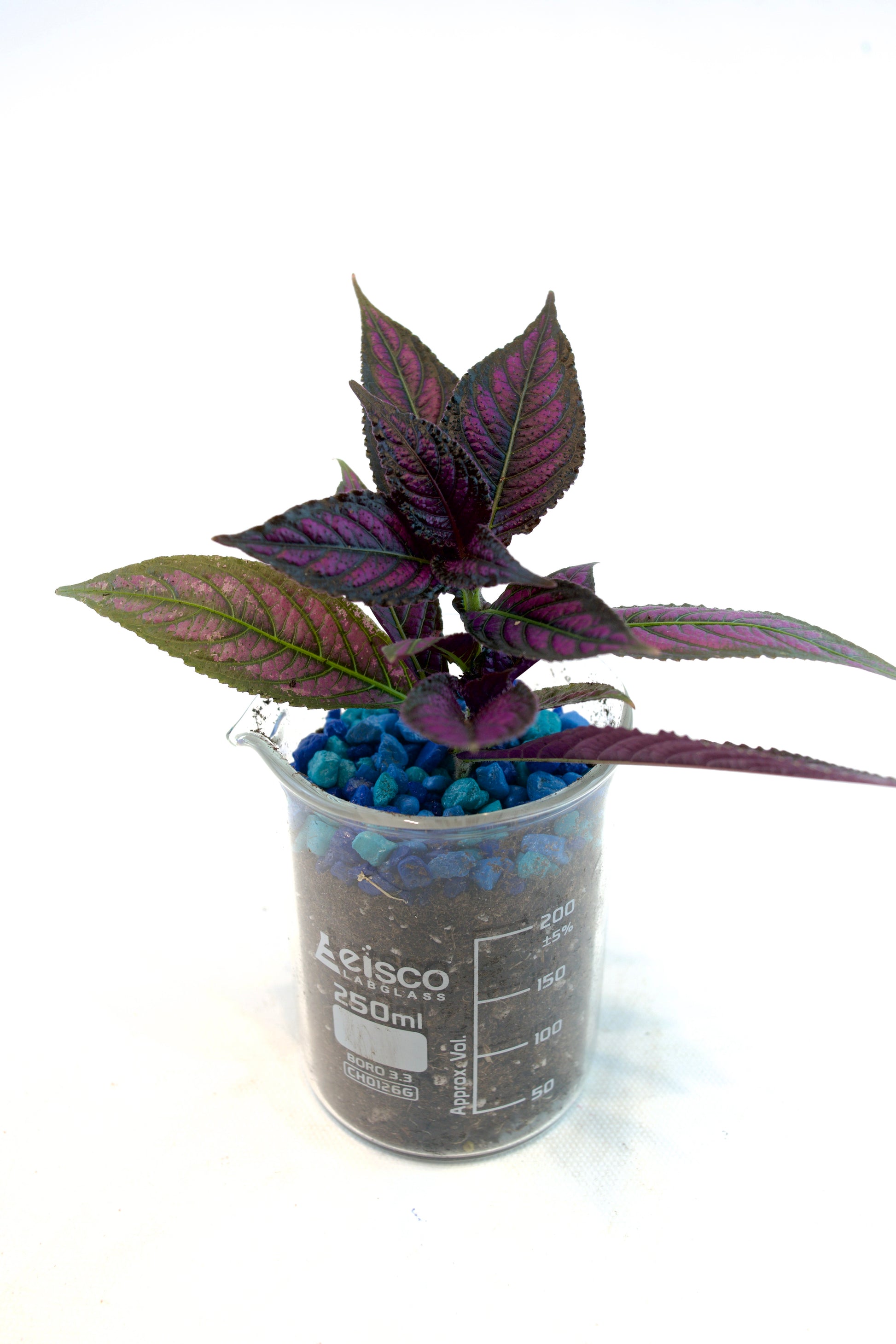 Bring a burst of color to your space with the Persian Shield (Strobilanthes dyerianus), a striking houseplant known for its shimmering, metallic purple leaves and lush green veins. Planted in a clean, modern 250ml lab beaker, this compact version makes a bold yet elegant accent for desks, windowsills, or gifts.