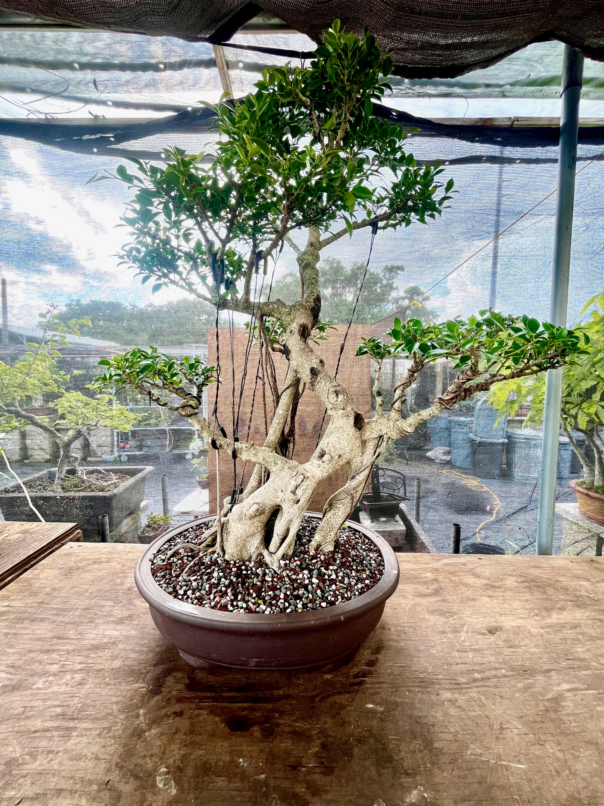 This extraordinary Tiger Bark Ficus (Ficus microcarpa) is a one-of-a-kind masterpiece, cultivated for over 16 years. Its aged trunk, striking bark, and sculptural form showcase the artistry of bonsai at its finest. Standing 46" tall in a 20" round ceramic pot, this tree embodies balance, strength, and beauty—making it an exceptional centerpiece for any serious bonsai collection.