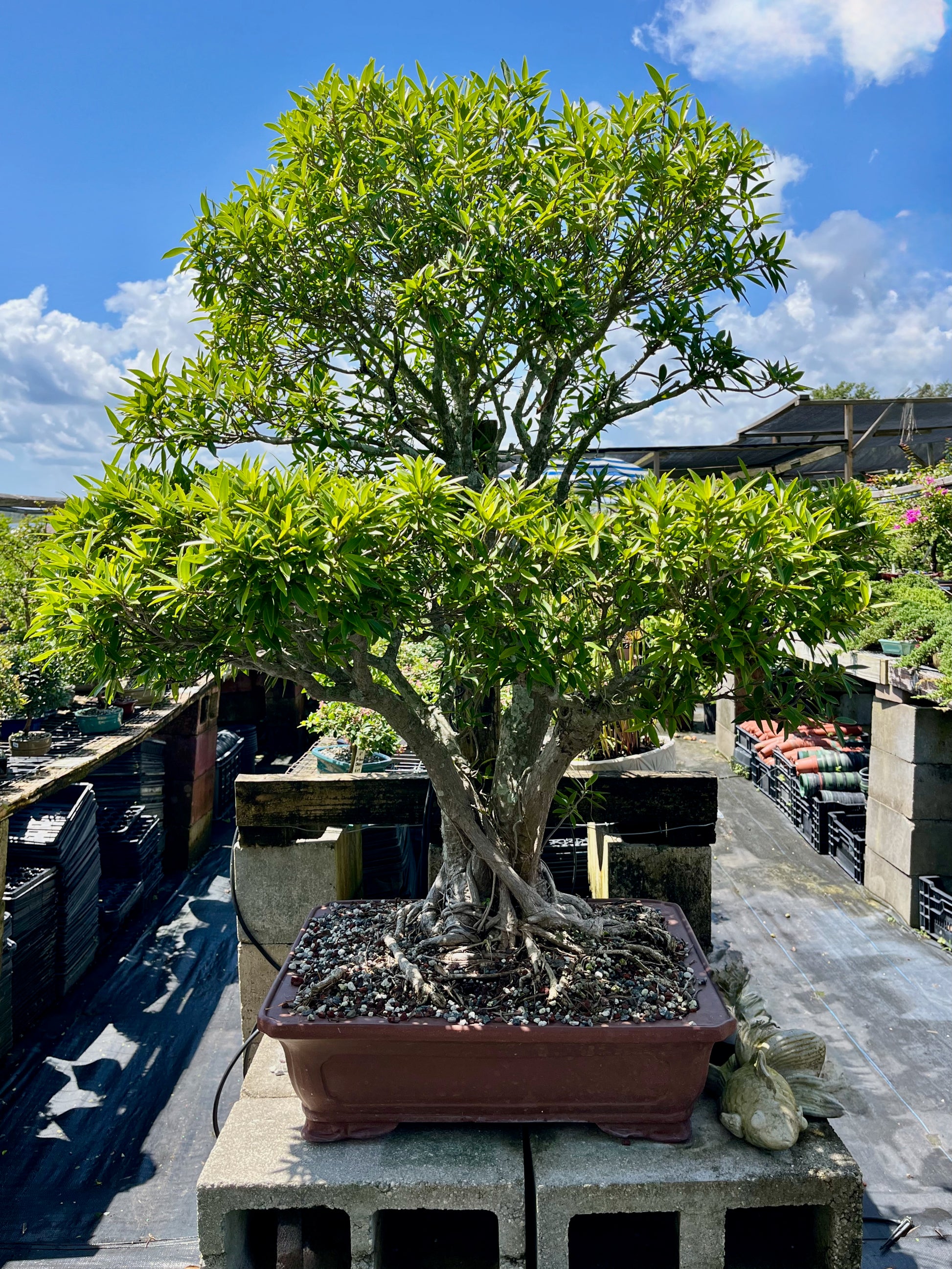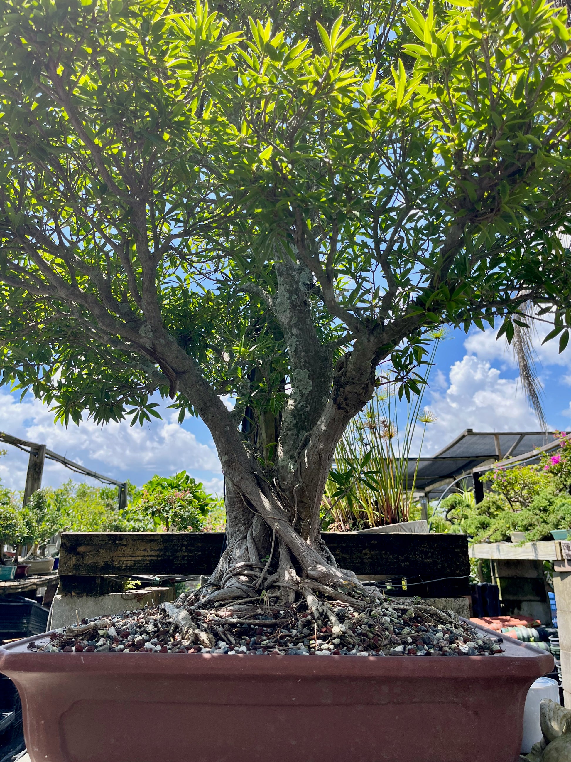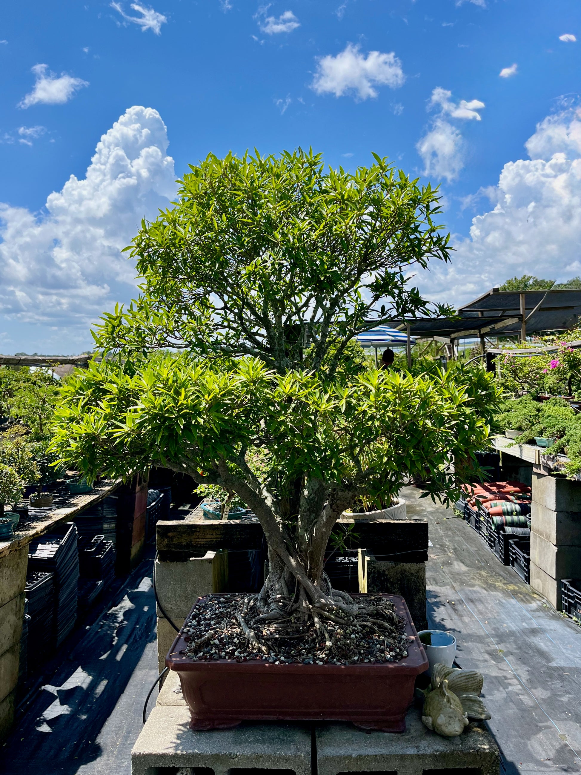 This magnificent Willow Ficus (Ficus salicaria) is a true bonsai masterpiece—over 35 years old and standing at an impressive 55″ tall in a 23″ ceramic pot. With its powerful exposed roots, mature branching, and elegant willow-like foliage, this bonsai captures the essence of age and refinement.
